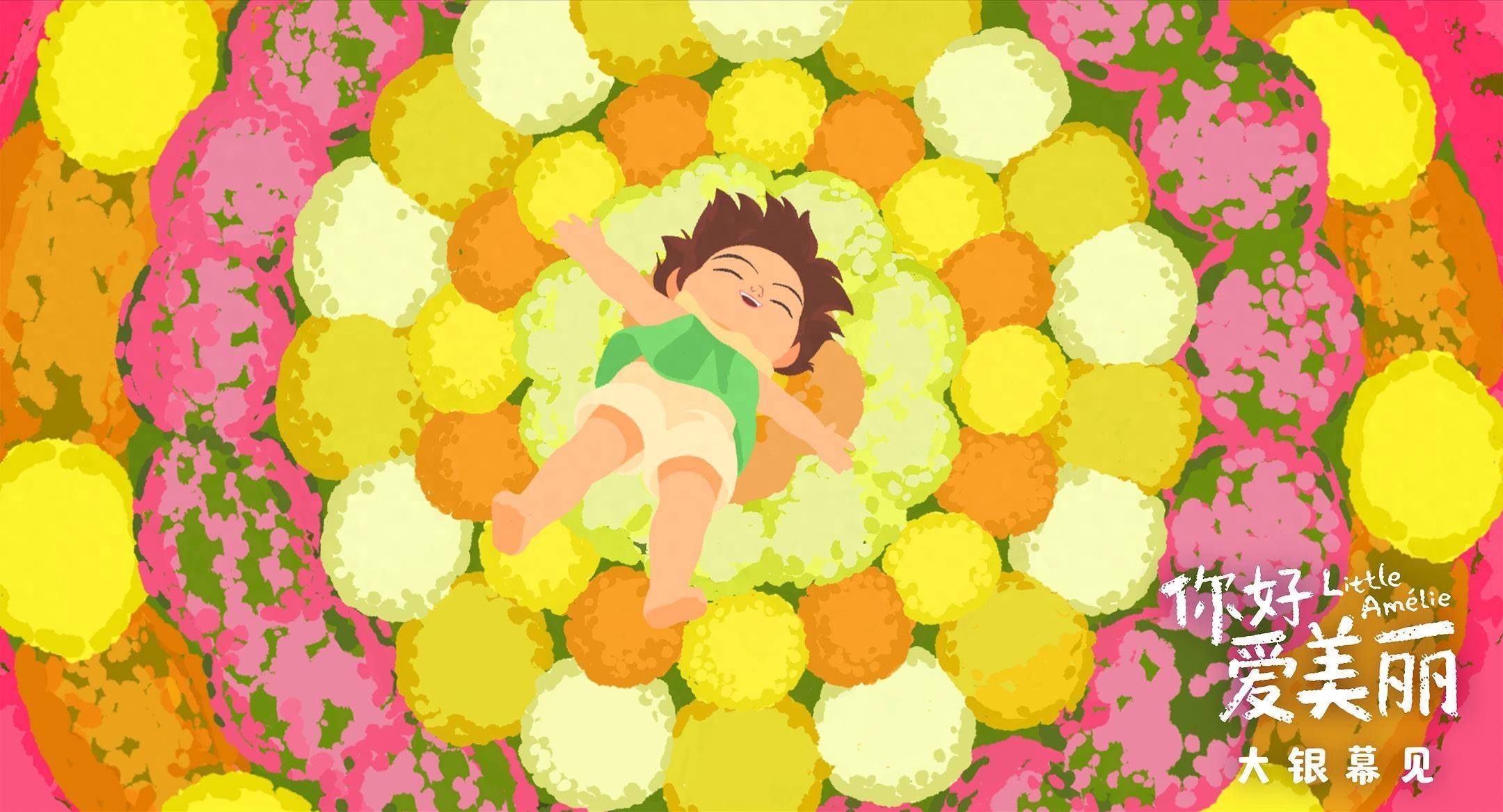 《你好,爱美丽》的艺术成就,很大程度上在于其动画形式完美服务了如此形而上的主题。影片采用印象派手绘风格,视觉上呈现出明亮鲜艳的马卡龙色调。色彩的运用既浪漫又克制:背景中团团簇拥的花朵犹如蓬松柔软的彩色云朵,接住从空中缓缓落下的爱美丽;人物线条简洁灵动,勾勒出女孩轻盈的身姿与飞扬的短发。